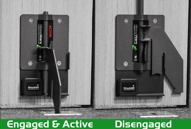 Activation is as simple as lifting a tab on the locking mechanism and letting it fall, self-guided, into place within the anchored floor plate. A few seconds and one action can turn a normal entry door into a armored-up door that can protect those sheltering inside the room until help arrives.